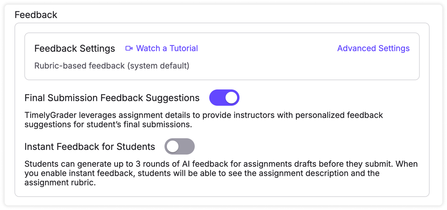 TimelyGrader’s default feedback structure provides clear, criterion-based comments aligned with your rubric. However, every assignment is different. With Advanced Feedback Settings, you can customize the tone, length, and structure of AI-generated feedback to fit your course and teaching style.