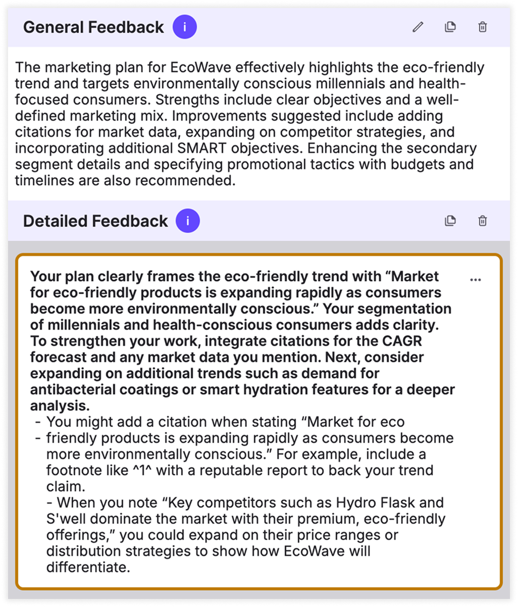 This option includes a paragraph of general feedback on the student's submission, along with up to five targeted suggestions for improvement.