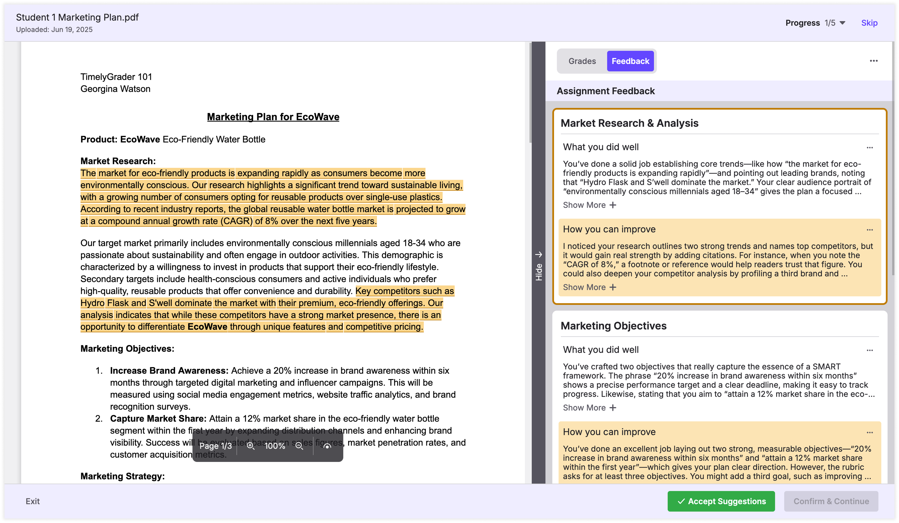 Alternatively, if you've reviewed TimelyGrader's grading suggestions and they look correct, you can click the "Accept Suggestions" button to apply them at any time. This will only apply the suggested grades to ungraded criteria.
