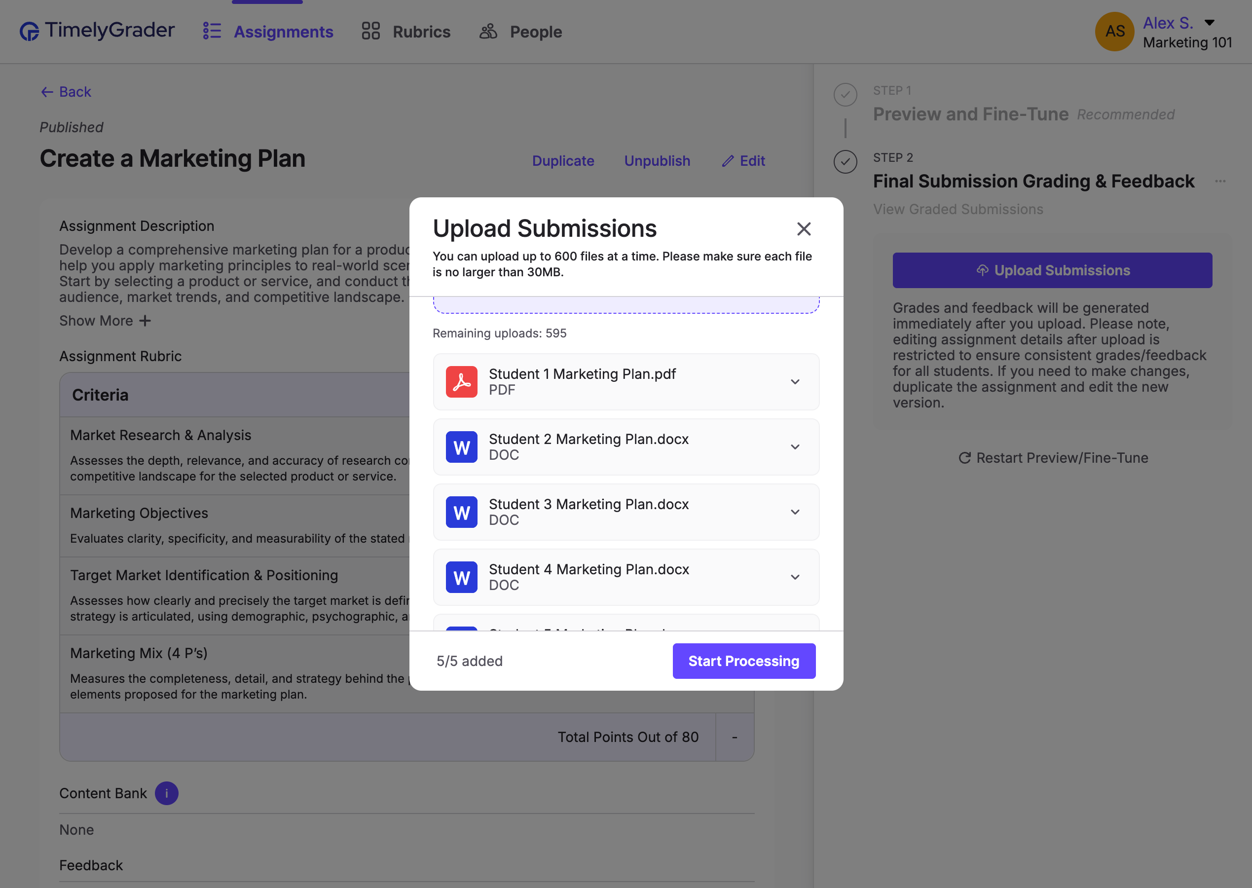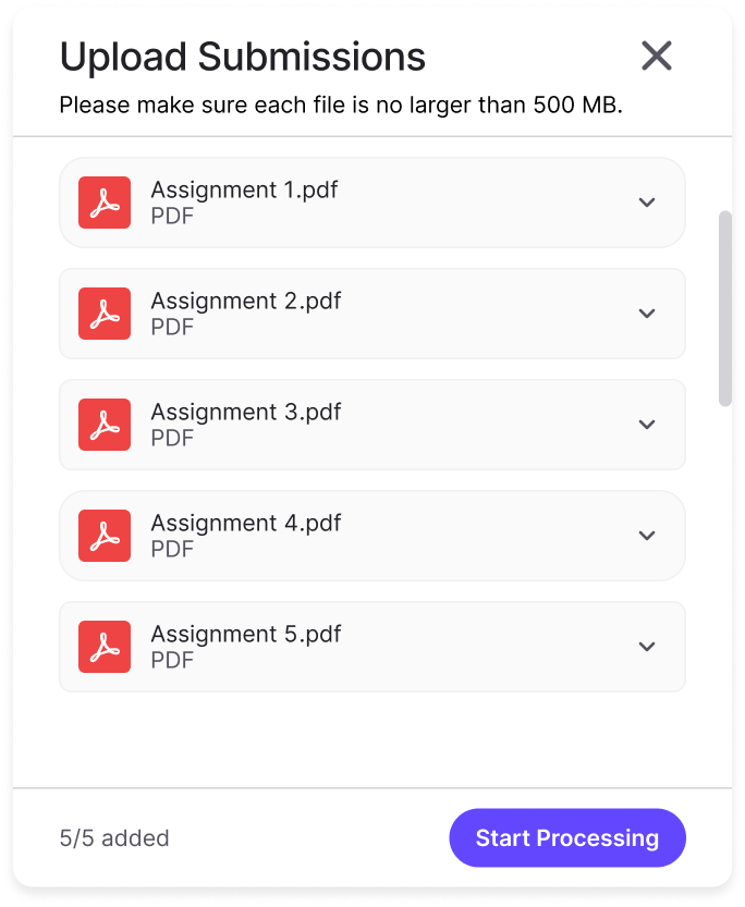 Once the submissions have all been added, you are ready to initiate processing. Click "Start Processing" to begin generating grading and/or feedback suggestions.
