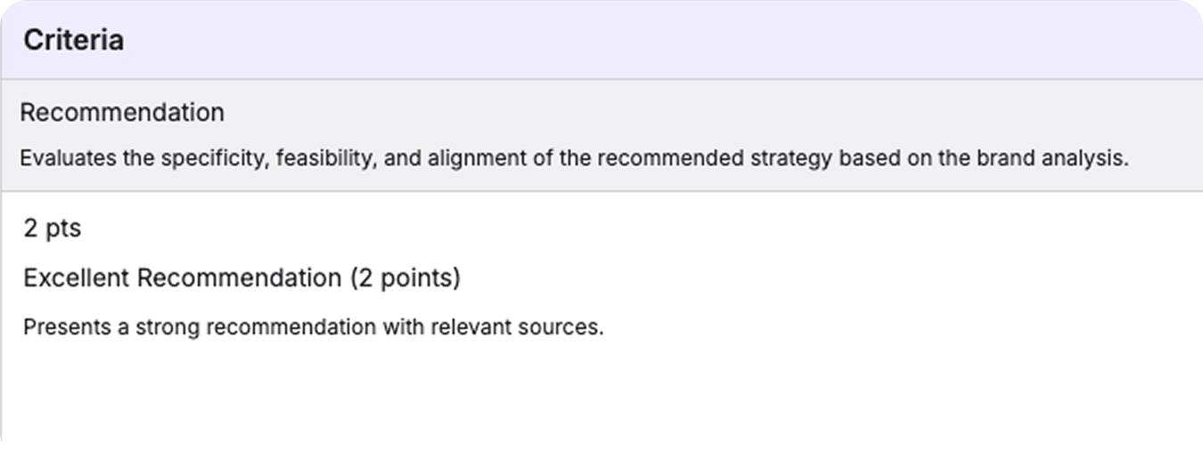 Sometimes the rubric is too general or hard to read the same way every time. Improve yours by adding clear performance descriptions for each rating level, replacing vague phrases (like “good recommendation”) with measurable indicators or adding criteria to match what you care about now. The more concrete the rubric, the more consistent the grading.