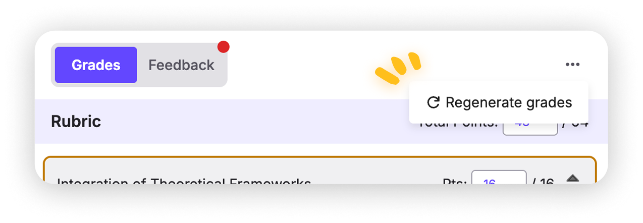 TimelyGrader’s Feedback Regeneration feature helps you produce more accurate, precise, and actionable feedback for students with your guidance. It’s designed to refine comments when the AI's original feedback doesn’t fully highlight the ideas or points you intended.