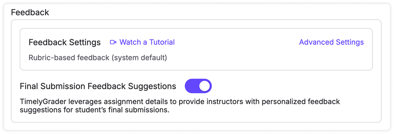 TimelyGrader’s default feedback structure provides clear, criterion-based comments aligned with your rubric. However, every assignment is different. With Advanced Feedback Settings, you can customize the tone, length, and structure of AI-generated feedback to fit your course and teaching style.